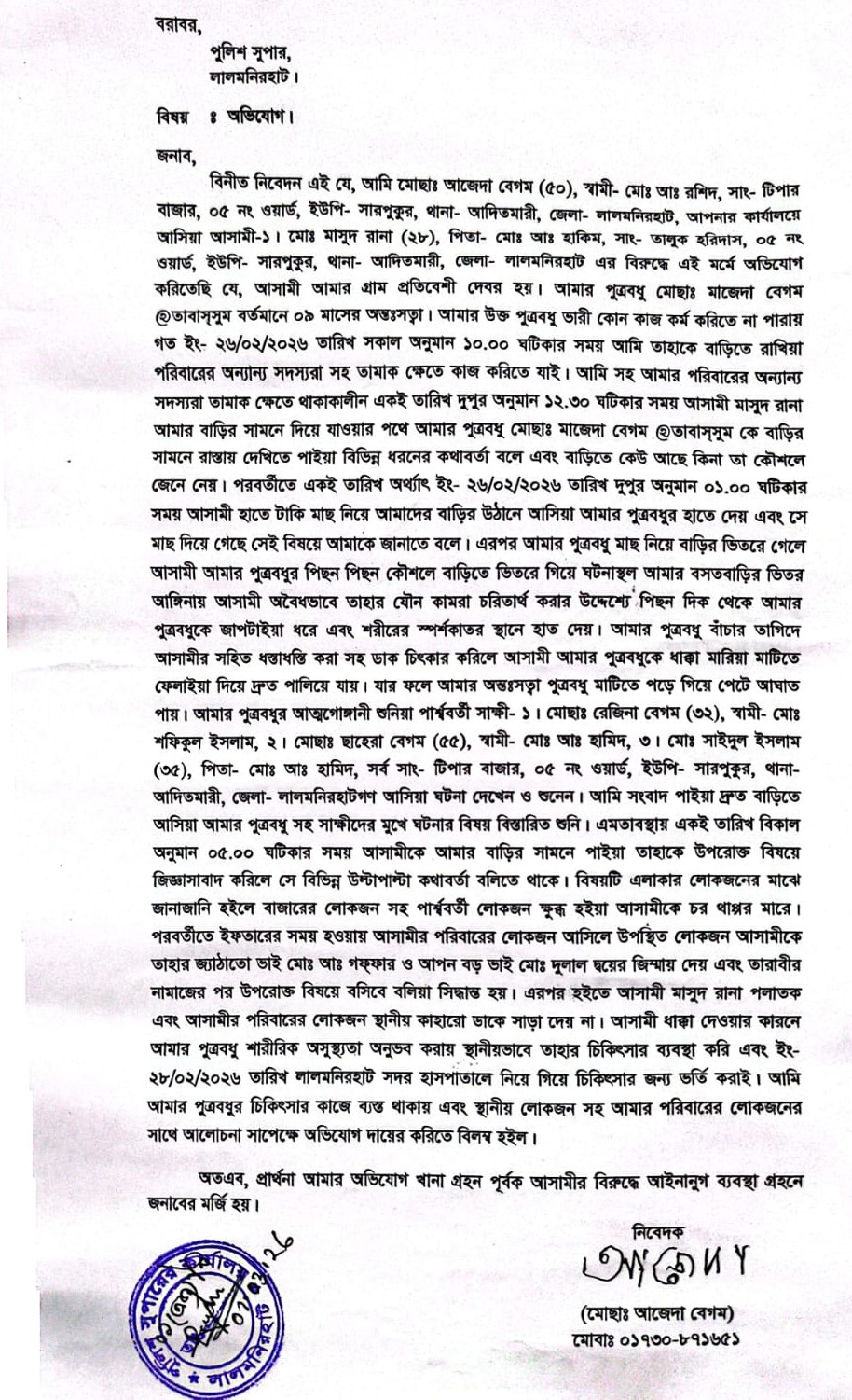 এ ঘটনায় রবিবার (১ মার্চ) দুপুরে ভুক্তভোগী মাজেদা বেগমের শ্বাশুড়ি আজেদা বেগম বাদি হয়ে লালমনিরহাটের আদিতমারী থানায় একটি অভিযোগ দায়ের করেন। বৃহস্পতিবার (২৬ ফেব্রুয়ারি) দুপুরে উপজেলার সারপুকুর ইউনিয়নের টিপার বাজার এলাকায় এই ন্যাক্কারজনক ঘটনাটি ঘটে।