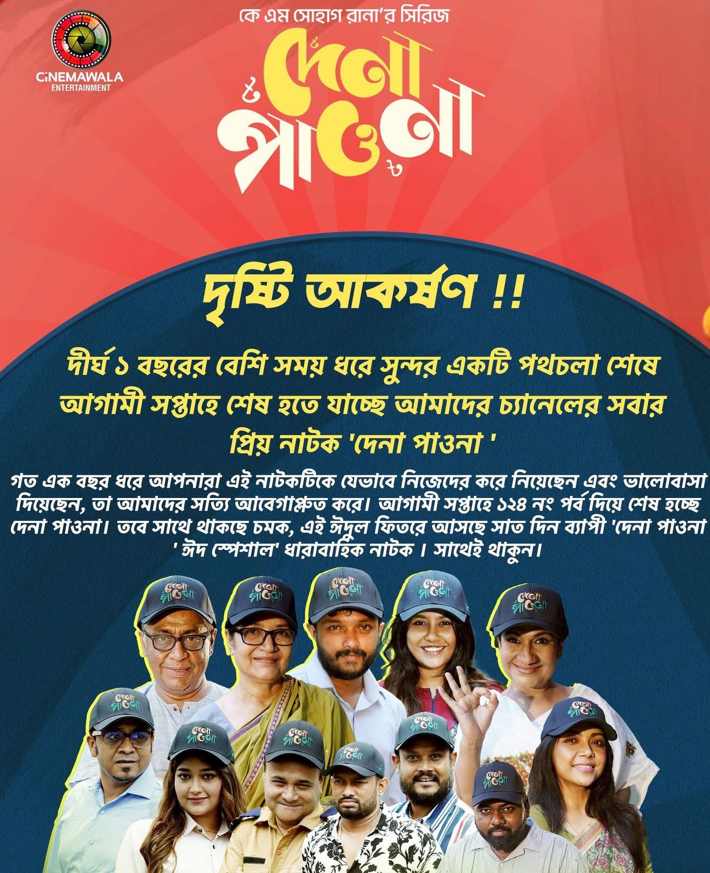 পারিবারিক গল্পের চিরচেনা স্বাদ নিয়ে দীর্ঘ এক বছরেরও বেশি সময় ধরে দর্শকদের হৃদয়ে জায়গা করে নেওয়া জনপ্রিয় ধারাবাহিক নাটক ‘দেনা পাওনা’ শেষ হতে যাচ্ছে। কে এম সোহাগ রানা রচিত ও পরিচালিত এই নাটকটি সিনেমাওয়ালা এন্টারটেইনমেন্ট ইউটিউব চ্যানেলে প্রচার হয়ে আসছিল।