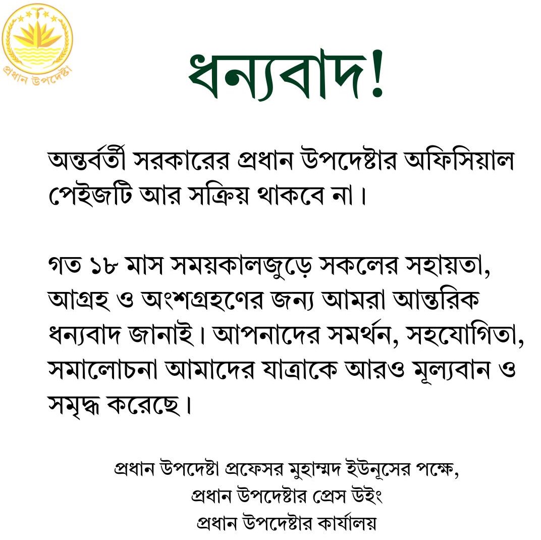 ফেসবুক পোস্টে জানানো হয়, Chief Adviser GOB (Head of the Government) নামের এই অফিসিয়াল পেজটি এখন থেকে আর সক্রিয় থাকবে না। ২০২৪ সালের ১৪ আগস্ট অন্তর্বর্তী সরকার গঠনের পর জনযোগাযোগের অন্যতম মাধ্যম হিসেবে এই পেজটি খোলা হয়েছিল। বর্তমানে পেজটিতে ফলোয়ার সংখ্যা ৪৪ লাখেরও বেশি।