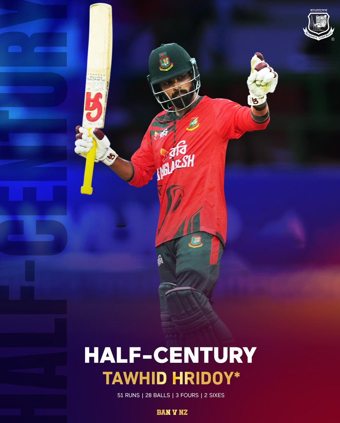 শামীম হোসেন পাটোয়ারিকে নিয়ে পঞ্চম উইকেটে তাওহীদ হৃদয়ের গড়া জুটিটা ছিল দুর্দান্ত। মাত্র ১৯ বলে ৪৯ রানের অপ্রতিরোধ্য পার্টনারশিপ গড়েন হৃদয়-শামীম। তাতেই জয়ের বন্দরে পৌঁছে যায় স্বাগতিক বাংলাদেশ। দলের হয়ে সর্বোচ্চ ৫১ রান করে অপরাজিত থাকেন তাওহীদ হৃদয়। মাত্র ২৯ বলে খেলা তার এই ইনিংসটি দুটি চার ও তিনটি ছয়ে সাজানো। আর মাত্র ১৩ বলে তিনটি চার ও দুটি ছয়ে ৩১ রানের একটি ক্যামিও ইনিংস খেলেন শামীম।